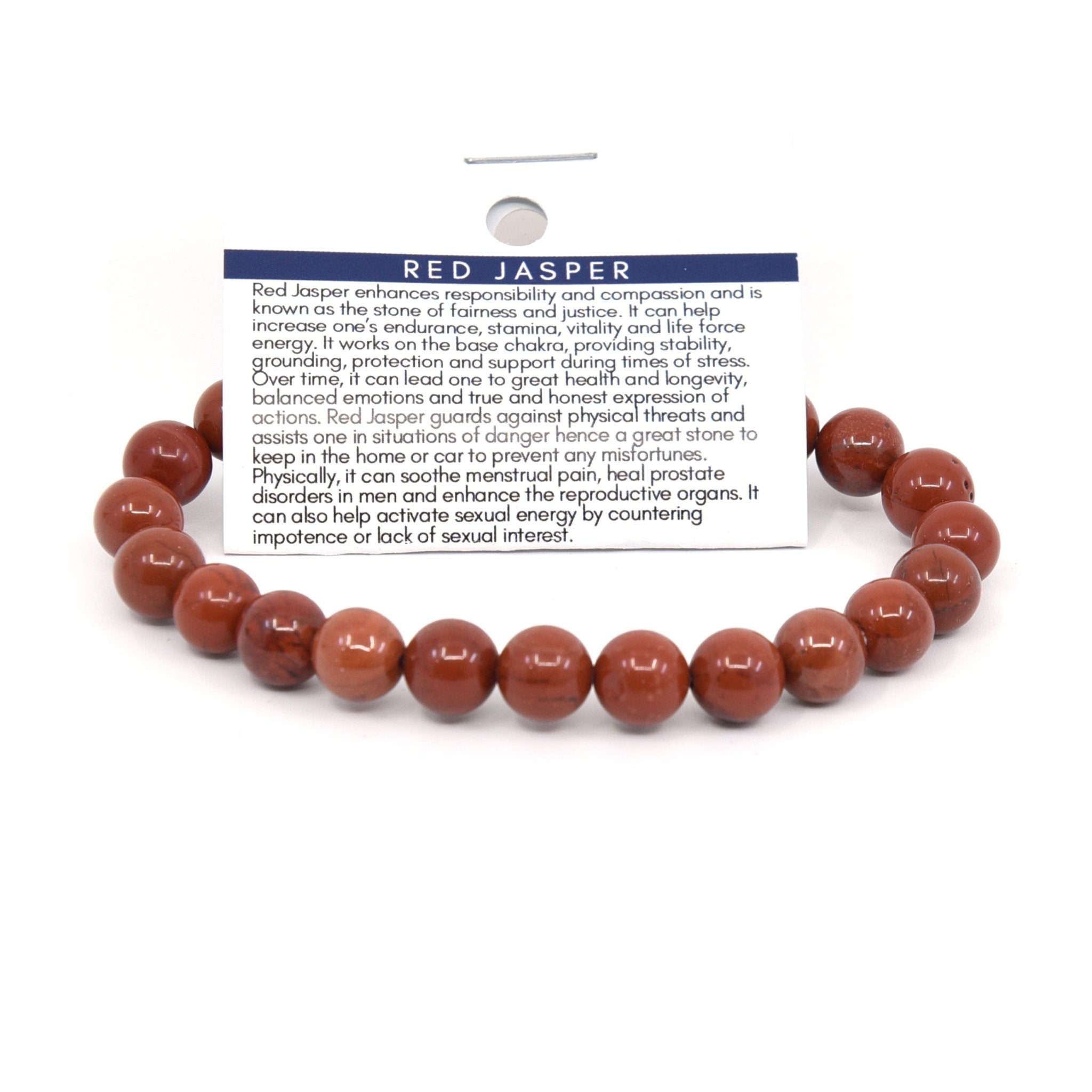 Red Jasper enhances responsibility and compassion and is known as the stone of fairness and justice. It can help increase one’s endurance, stamina, vitality and life force energy. It works on the base chakra, providing stability, grounding, protection and support during times of stress. Over time, it can lead one to great health and longevity, balanced emotions and true and honest expression of actions. Red Jasper guards against physical threats and assists one in situations of danger hence a great stone to keep in the home or car to prevent any misfortunes. Physically, it can soothe menstrual pain, heal prostate disorders in men and enhance the reproductive organs. It can also help activate sexual energy by countering impotence or lack of sexual interest.
